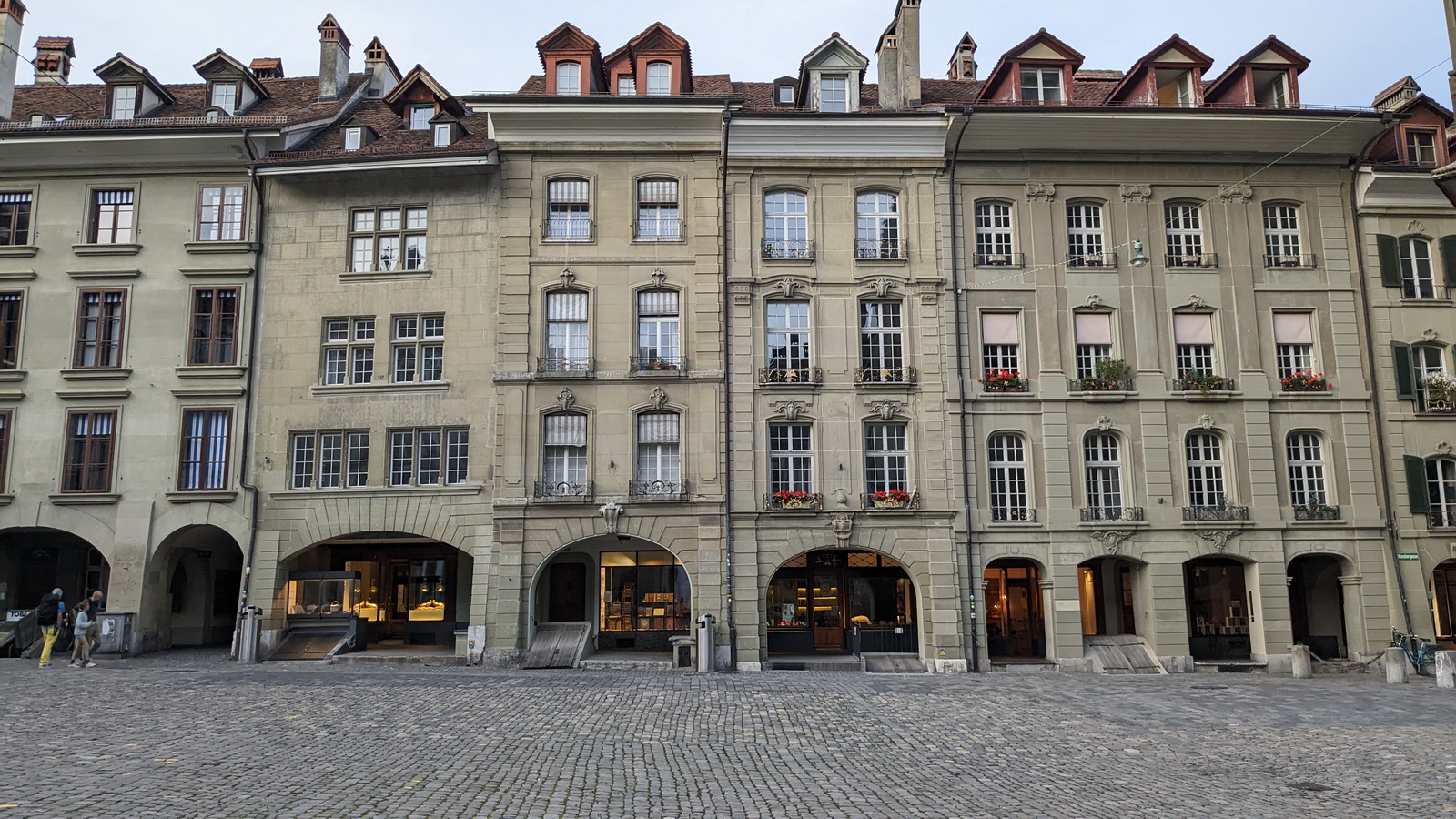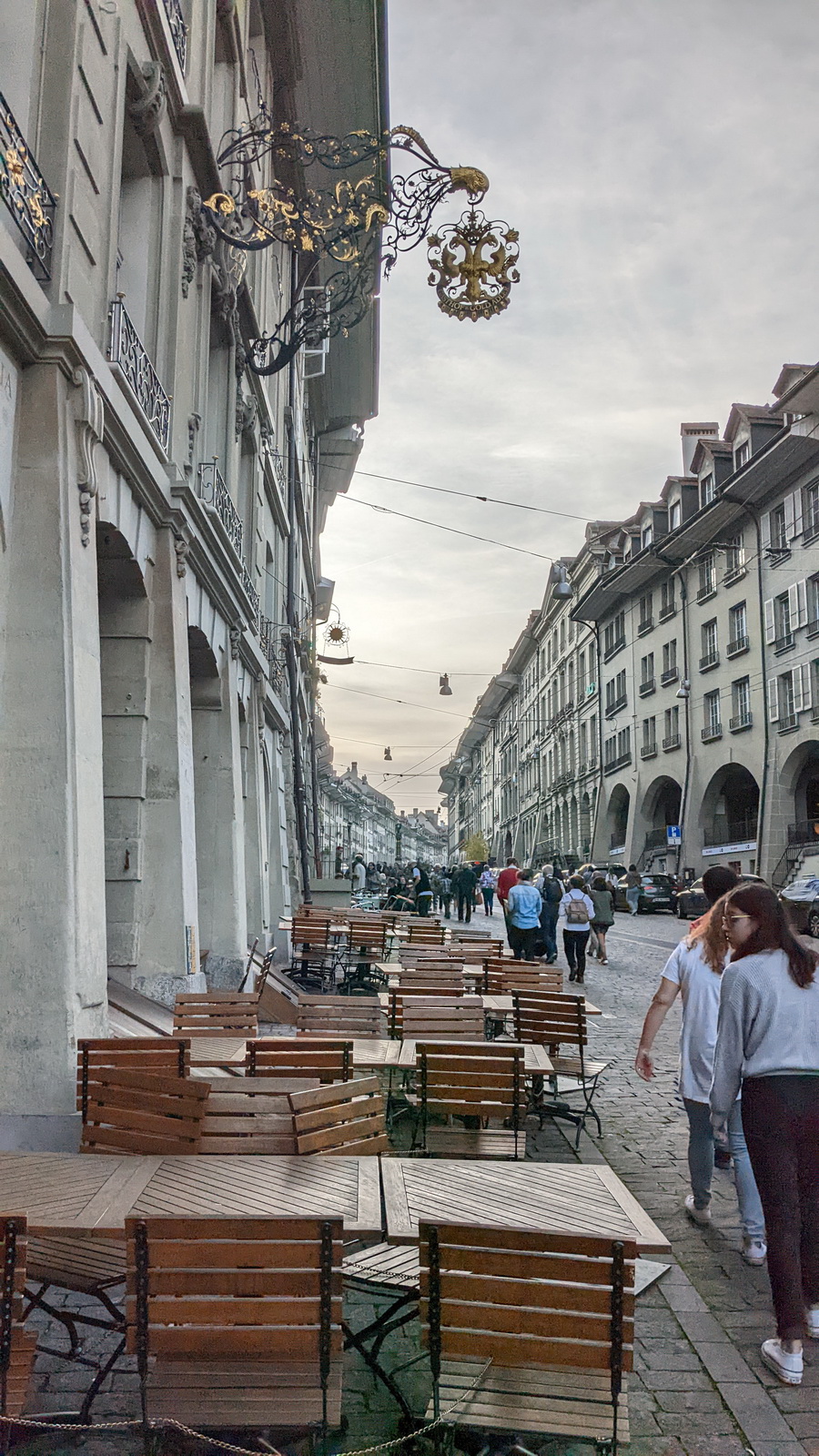 On traverse la vieille ville typique par ses maisons collées et les arches qui permettent de se balader à l’abri de la pluie. La rue est encore pavée mais non piétonne. Les pierres sont grises et la ville un peu morose…