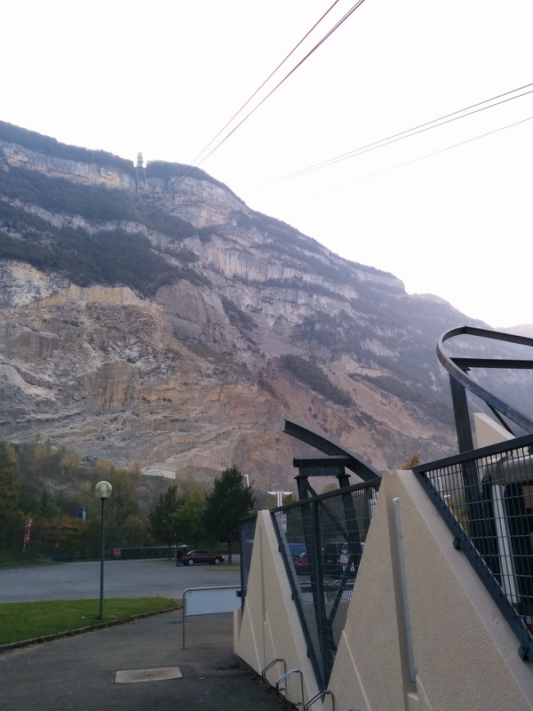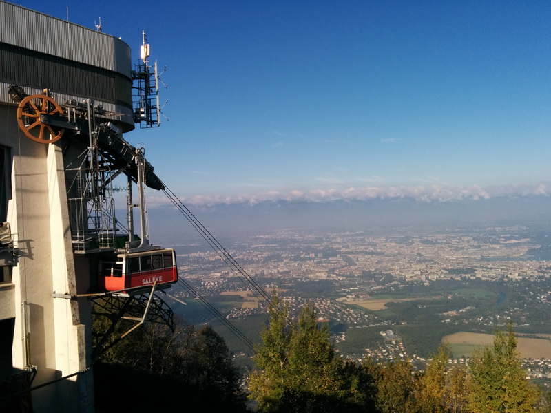 J’ai donc pris le tram ce matin puis le bus jusqu’à un village frontalier, Veyrier. J’ai ensuite marché dix minutes jusqu’au téléphérique tout en passant la douane française, le Salève étant sur territoire français.